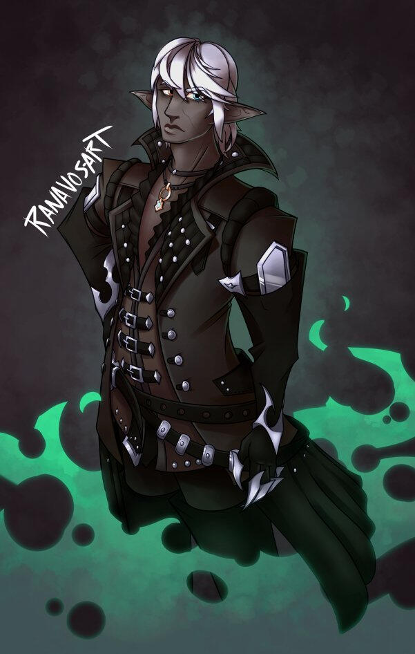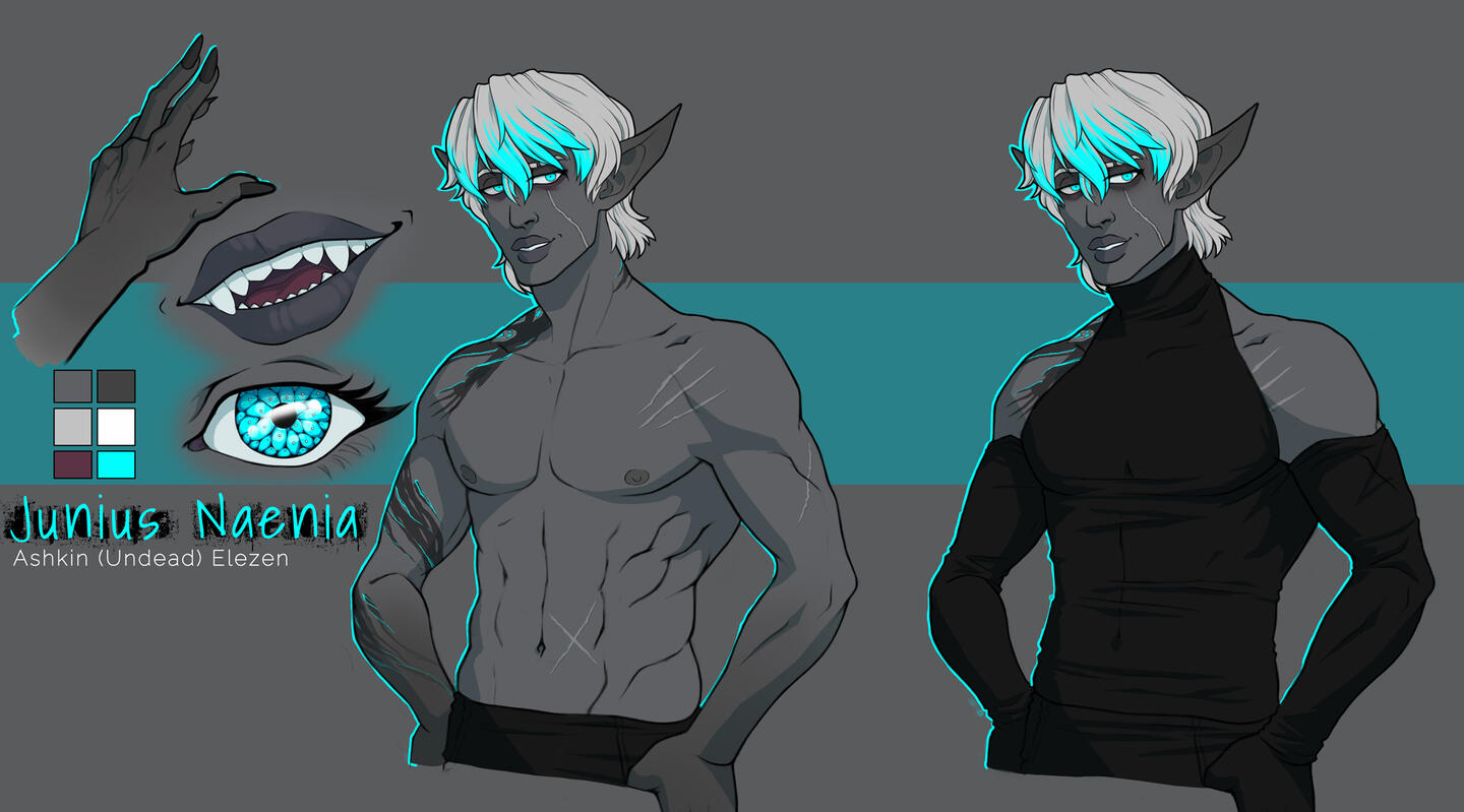 ⌠At a Glance⌡: The elezen looks on par with most standard Duskwight, however, upon closer inspection, one can see the smaller, more refined details that isolates him into something more unique. When visible, his extremities are much darker, and blackish-blue veins course just beneath the surface of his skin.⌠General⌡: Junius is a strikingly tall elezen of dark grey flesh and light ashen hair with white or teal streaks. On all accounts, he is athletically fit and toned, notably someone who once took particular care of himself despite his current disposition. Those who knew him prior to his death would reflect upon a rather stately individual of immaculate appearance which seems to have stayed despite his condition of being undead.The elezen is hardly ever seen outside of a suit or long coat, usually of ebon color and made from fine leather or linen. He takes extreme pride in his appearance and hygiene which speaks more for himself than his personality. At a glance, one can tell he is very articulate about his style and comforts; everything must be made to match accordingly, sparing very little for any deviations. (On occasion, he may dress in a more casual and relaxed attire, but it is rare to see that.)One of his more striking features are his elongated canines and pointed teeth which is likely a mutation of his condition or the magic that caused such. His smooth visage has also led others to question what methods he uses to keep himself appearing pristine. On the outside, there are no visible signs of decay, likely due to a strong stasis spell of Void ingenuity. The insides, however, are a completely different story. Someone or something went through great lengths to keep the elezen lovingly perfectly preserved.⌠Distinguishing Marks⌡: A visible scar along his left cheek and brow. A minor scar along his right cheek. When sleeveless, he has a long and winding tattoo of a Baalzephon/Persona *(EE, pg. 297)* wrapped around his entire right arm, up to his neck.⌠Usual Accessories⌡: